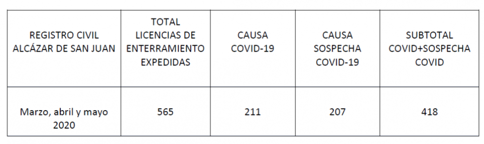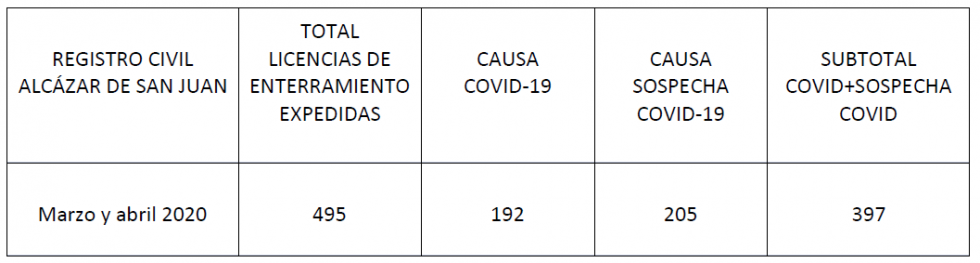 Hay que tener en cuenta que las licencias de enterramiento se expiden en el Registro Civil de Alcázar independientemente del lugar donde se entierra al fallecido, así como que en Alcázar se ubica el hospital La Mancha Centro, donde a lo largo de la pandemia han fallecido pacientes procedentes de todo el área de salud, es decir de pueblos cercanos. En el cementerio de Alcázar de San Juan, la cifra de enterramientos, según los datos facilitados por la alcaldesa al finalizar el mes de abril, era de 188, y así lo confirmaban las bajas en el padrón (109 en marzo y 79 en abril).