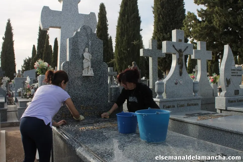 “Venimos todos los años sin falta a limpiar las sepulturas”, así han explicado Virginia y Clara Isabel a elsemanaldelamancha.com su tradición de acudir al cementerio municipal de Alcázar de San Juan para limpiar las lápidas de sus familiares en los días previos a la festividad de Todos los Santos, el 1 de noviembre, una tradición que sigue perdurando y desafiando el tiempo, ya que en pleno siglo XXI son muchas las personas que siguen manteniendo este proceso año tras año. Y es que, aunque cada vez haya más incineraciones, los columbarios también se adecentan y lucen durante estos días ramos de flores nuevos.