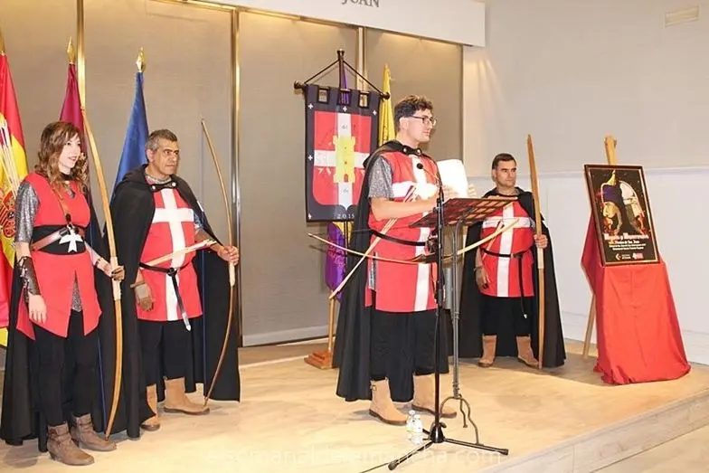 Tras la presentación del cartel, los integrantes del C.D. Arqueros del Torreón subieron al escenario –ataviados con trajes medievales- y su presidente, Luis Felipe Casero, a la voz de ‘¡Escúcheme!’ realizó un pregón en el que habló de las novedades de las fiestas de este año, de los valores de los caballeros, del nacimiento del tiro con arco y de la necesaria convivencia vecinal, representada en la asociación Al-Kasar de Moros y Cristianos “que nos ha acogido con los brazos abiertos”. Casero invitó a alcazareños y alcazareñas a disfrutar y participar en la Fiesta, como ellos mismos harán este año formando una fila cristiana.
