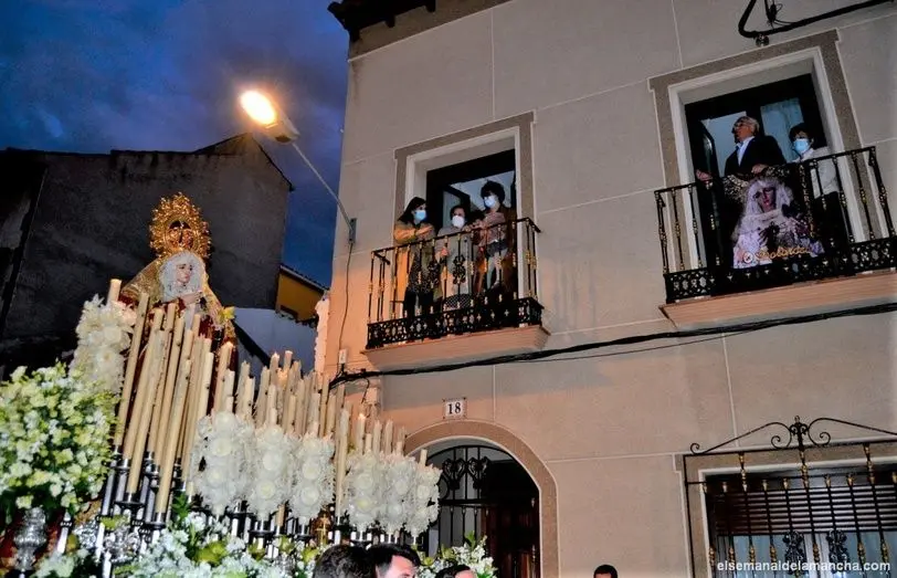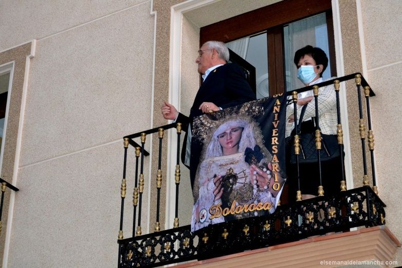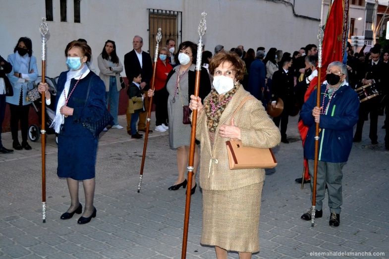 Detrás, el paso de la Virgen, La Dolorosa, acompañada por la Banda Municipal de Música, franciscanos, responsables y mujeres de la Cofradía, represenantes de otras hermandades, autoridades civiles y cuerpos de Seguridad.