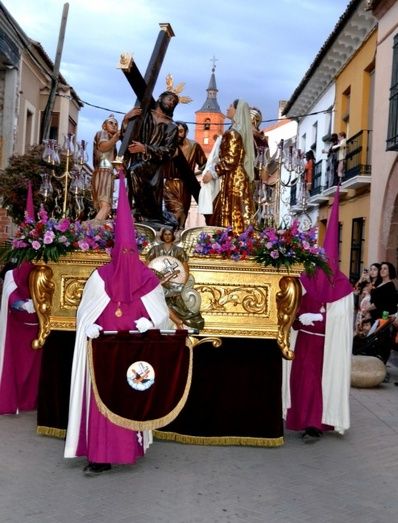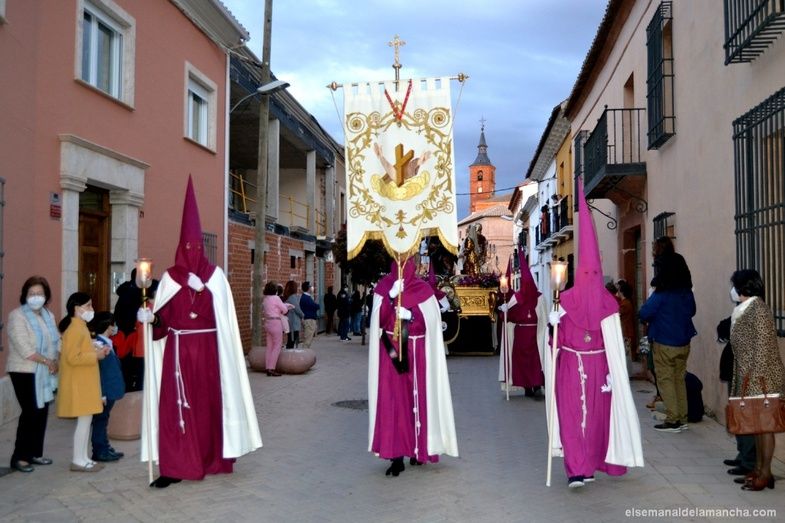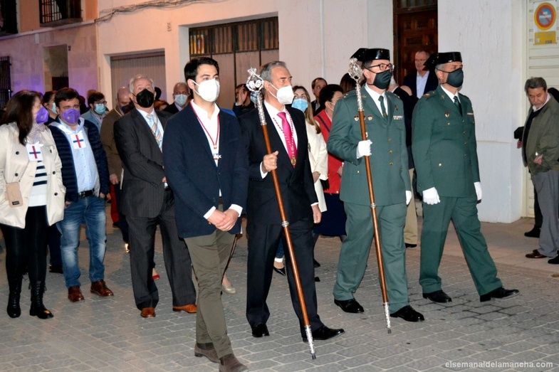 Abriendo el desfile, la Banda de Cornetas y Tambores de Herencia. A continuación el paso titular, formado por las cinco figuras de Jesús Caído, La Verónica, El Cirinero y dos soldados romanos, acompañado por nazarenos de color cárdena y blanco.