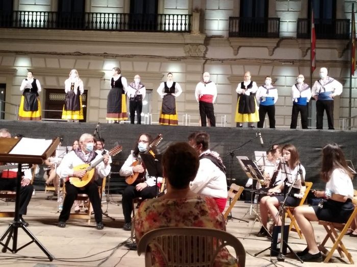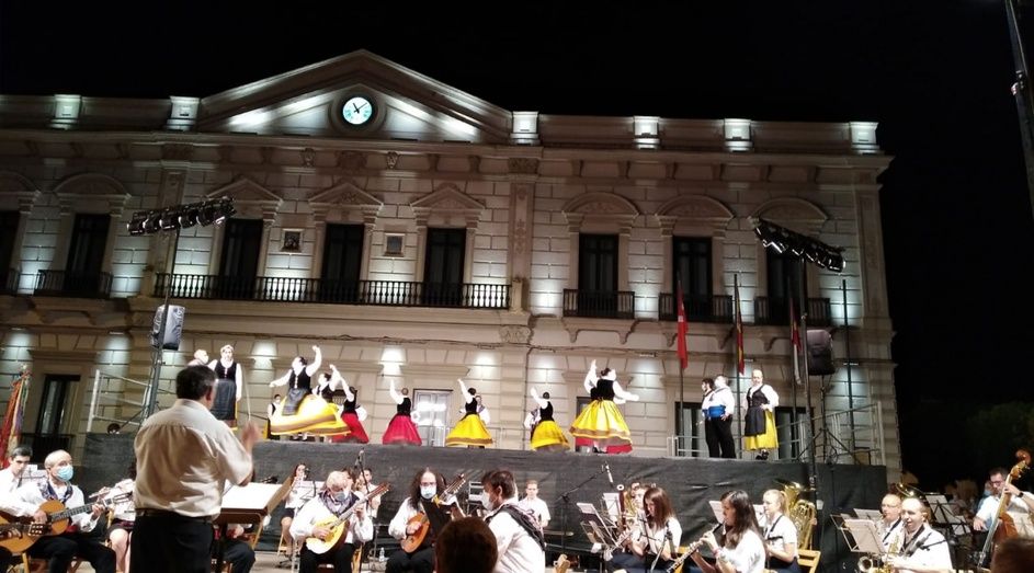 La plaza de España de Alcázar de San Juan se convirtió ayer en escenario del espectáculo ofrecido "Al Alimón" por la agrupación de Coros y Danzas y la Banda de Música. Una edición especial del Festival Internacional de Folclore que todos los años se celebra en esta localidad y que en esta ocasión ha estado caracterizada por el Covid y las medidas de seguridad, mascarillas, distancia social, etc.