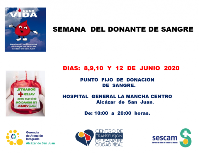 La Asociación de Donantes de Sangre del SESCAM de Alcázar de San Juan hacen un llamamiento a la población y a todas las personas que quieran colaborar e informan sobre la apertura de su punto fijo para extracciones en el Hospital La Mancha de cara a esta semana, en la que van a celebrar la Semana del Donante.