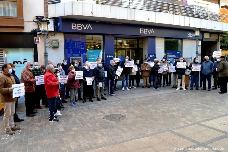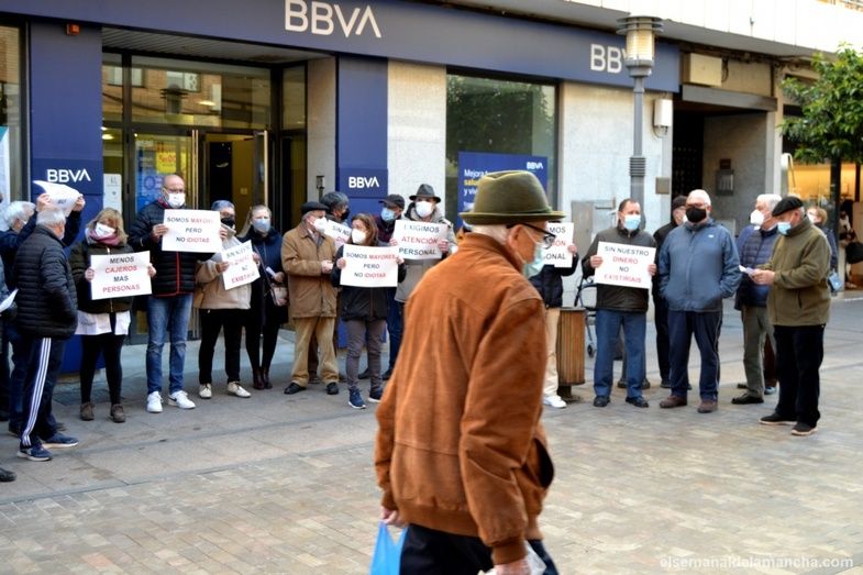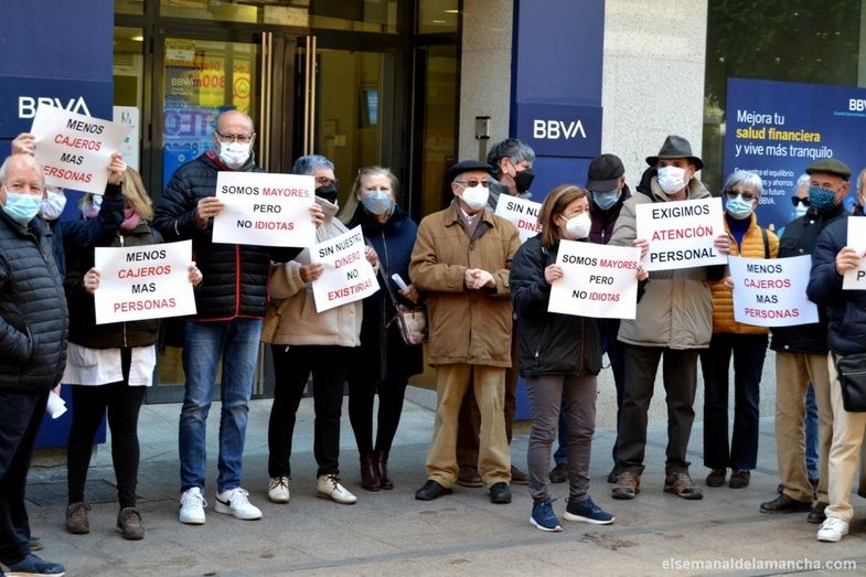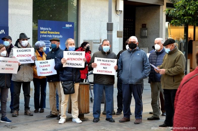 de San Juan, se han concentrado esta mañana delante de la sucursal de BBVA en la calle Emilio Castelar, para protestar contra lo que consideran un trato "injusto e inhumano", por parte de los bancos, donde en los últimos años viene imponiéndose a los mayores el uso de las nuevas tecnologías, en muchos casos sin alternativa ni ayuda suficiente para manejar tanta "traba tecnológica".