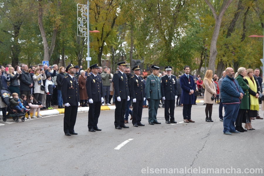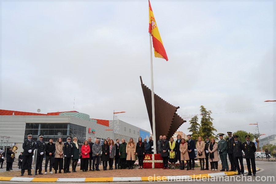 Los medios de comunicación han sido este año los protagonistas del acto conmemorativo del Día de la Constitución celebrado en Alcázar de San Juan en la rotonda situada al final de la calle Los Ángeles, donde se ubica el monumento a la Carta Magna. Prácticamente toda la Corporación Municipal, miembros de los Cuerpos de Seguridad, banda de música, representantes de los medios de comunicación, de las asociaciones y colectivos locales, exalcaldes y público en general se han dado cita en este espacio de la avenida de la Constitución para presenciar el acto y especialmente la ofrenda floral e izada de bandera.