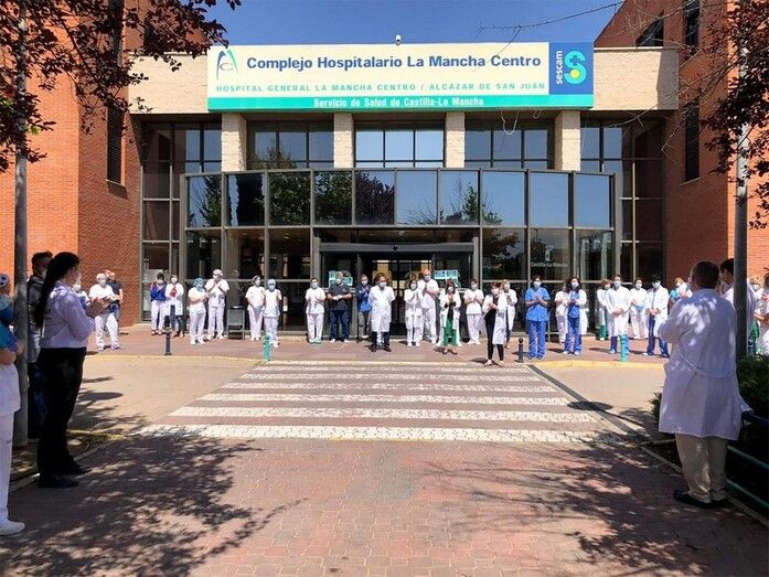 Medio centenar de profesionales del Hospital General Mancha Centro de Alcázar de San Juan han guardado un minuto de silencio este mediodía en el primer día de luto oficial por las víctimas que ha dejado el Covid-19 en nuestro país.