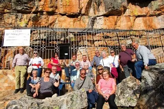 A las 14,45 horas, llegamos al Hostal de Marco, en la localidad de Fuencaliente, donde habíamos reservado la comida. La atención fue excelente, la comida copiosa y el precio muy económico, algo que agradecimos fervientemente, después de la caminata de la mañana. Por la tarde, el guía nos llevó a Sierra Madrona, para ver unas pinturas rupestres que son las segundas más importantes de la península, después de las de Altamira. Le llaman “la capilla Sixtina del arte rupestre esquemático” de la península y se encuentran en el abrigo de Peña Escrita, un acantilado de rocas con entrantes y salientes. No están al resguardo de una cueva como las de Altamira, sino al aire libre, lo que las hace especialmente frágiles. Están datadas de entre 3000 y 5000 años (las de Altamira son de hace 14000 años) y el guía nos ilustró comparando ambas pinturas para dejarnos ver como éstas reflejan la evolución de los seres humanos a través de 10000 años. En Altamira dibujaban animales como rito mágico para hacer próspera la caza, En Peña Escrita se dibujan seres humanos, hombres y mujeres y, algunas de estas, pariendo, lo que indica la evolución del icono mágico hacia el fenómeno de la reproducción. Llegar a Peña Escrita fue toda una aventura de esfuerzo para escalar por un camino de cabras hasta la cima. Algunos viajeros desistieron de subir pero la mayoría no dudaron en hacerlo a pesar del esfuerzo que conllevaba. De ello queda constancia en las fotos que grabaron el momento de la llegada.
