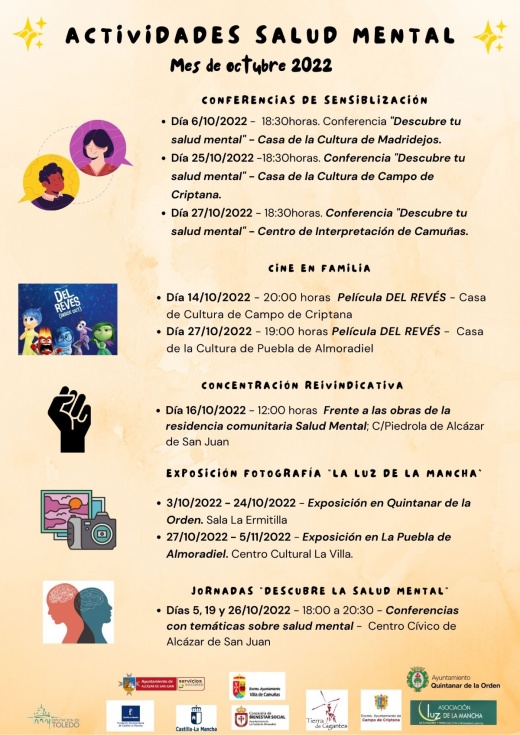 También habrá jornadas de Cine en la Puebla de Almoradiel, donde también llegará la exposición de fotografías “La luz de la Mancha” , en la que 42 autores de la región muestran su visión sobre la salud mental (actualmente en la Ermitilla de Quintanar de la Orden, luego irá a la Puebla y posteriormente a Madridejos).