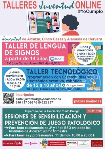 Debido a los protocolos sanitarios frente al coronavirus y a las recomendaciones de las autoridades sanitarias de limitar los aforos, la concejalía de Juventud ha apostado por actividades online en los próximos meses. En este formato se desarrollar el Taller de Lengua de Signos, dirigido a jóvenes a partir de 14 años. Se impartirá lunes y miércoles desde el 28 de octubre al 18 de diciembre de 17:00h a 18:30h, con un total de 7 sesiones. El taller tiene un precio de 13 euros, con descuento del 50% con Carnet Joven.