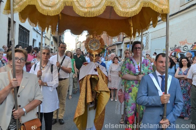 Cientos de personas se han dado cita esta tarde a lo largo del nuevo itinerario dispuesto por las calles de Alcázar de San Juan para ver pasar la procesión del Corpus Christi, una de las más multitudinarias de los últimos años, tanto en público como en participación.