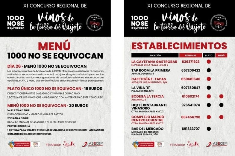 - Menú 1000 no se equivocan (20 euros): 1er plato a elegir pisto con huevo y magro migas de pastor, 2ª plato a elegir: bacalao en cama de asadillo o chuletillas de cordero y de postre bizcochá manchega; más 1 botella para cuatro personas o una copa de los vinos que han ganado con anterioridad este concurso.