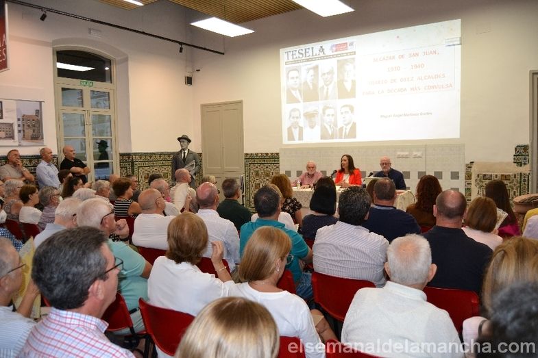 Miguel Ángel Martínez Cortés, escritor, investigador enamorado de la historia local y jefe de la policía municipal en Alcázar de San Juan, presentó ayer jueves su tercera "Tesela" (publicaciones del Patronato de Cultura), titulada "Alcázar de San Juan, 1930-1940. Diario de diez alcaldes para la década más convulsa". El acto convocó a multitud de personas en el nuevo Centro de Interpretación y Recepción de Visitantes (antigua Fonda de la Estación) y contó con la presentación de la alcaldesa de Alcázar de San Juan, Rosa Melchor, y la intervención de Miguel Ángel Martínez Martínez (exvicepresidente del Parlamento Europeo), autor del prólogo.