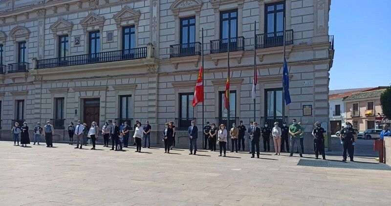 Los grupos municipales del Ayuntamiento de Alcázar de San Juan, agentes de las Fuerzas y Cuerpos de Seguridad del Estado, trabajadores y vecinos de Alcázar han guardado este miércoles, a las doce del mediodía y en la puerta del Ayuntamiento, un minuto de silencio por las víctimas del COVID19.