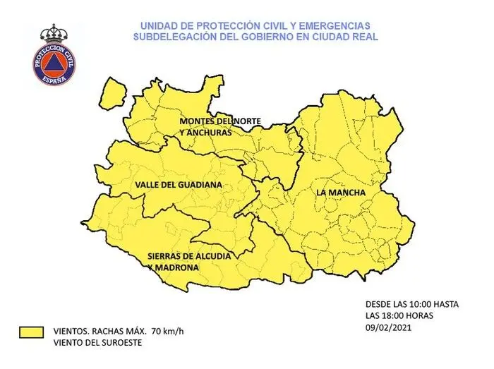 En concreto, Protección Civil informa de episodios de fenómenos meteorológicos adversos para el día 09/02/2021, que afecta a la provincia de Ciudad Real.