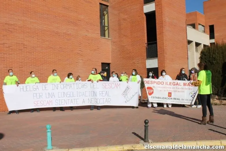 Los trabajadores informáticos del Sescam pertenecientes al Hospital General La Mancha Centro se han vuelto a concentrar este martes a las puertas del centro hospitalario a la espera de la mesa sectorial en la que presumiblemente se decidirá cómo se aplica la Ley 20/2021, publicada el 29 de diciembre, de medidas urgentes para la reducción de la temporalidad en el empleo público.