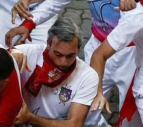 San Fermín, pues casi todos los años participa como aficionado práctico y gran amante de la fiesta de los toros; pero sí una de las veces de mayor riesgo, pues el encierro de esta mañana de los Cebada Gago (quinto de este año) ha sido sin duda uno de los más peligrosos de los últimos años, con una manada muy abierta desde el principio y tres heridos por asta de toro. Un encierro casi para expertos, a galope hasta Mercaderes, en el que hemos podido ver corriendo a Ortega en el tramo entre la Estafeta y la entrada a la plaza, donde corre habitualmente. En su camiseta, el escudo de Alcázar de San Juan, presente siempre en estas fiestas.