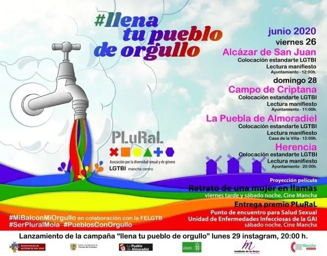 La asociación PLuRaL por la diversidad sexual y de género LGTBI Mancha Centro, promueve en 2020 una campaña en redes sociales para celebrar el Día Internacional del Orgullo LGTBI. Con el lema #llena tu pueblo de orgullo, se lanzará esta iniciativa el próximo 29 de junio en Instagram. También colocarán el estandarte arcoíris en los ayuntamientos de Alcázar de San Juan, Campo de Criptana, Herencia y La Puebla de Almoradiel.