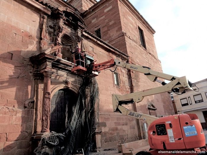 Después de retirar la malla de protección que durante meses ha estado instalada en la puerta principal de la iglesia, en declaraciones a elsemanaldelamancha.com, la restauradora Cristina Peña ha explicado que lo primero será realizar un estudio patológico para concretar el estado actual y plantear una propuesta de intervención, que tendrá que ser autorizada por la Junta de Comunidades, a través de la Consejería de Cultura (Patrimonio), como paso previo a su ejecución. "La semana pasada ya tuvimos una reunión en Ciudad Real con el jefe de servicio de Patrimonio para ver la situación...Lo primero que hay que abarcar, antes de nada, es la limpieza de los elementos y de la cubierta, muy deteriorados por la palomina que se ha ido acumulando con el paso del tiempo... Además, de forma paralela iremos haciendo el proyecto, para cuando nos den permiso abarcar la conservación de la fachada, que tendrá que hacerse por fases, en función de la financiación que vayan teniendo. Pero sobre todo, lo más urgente es acometer actuaciones encaminadas a la consolidación, así como diversas medidas preventivas. Y más adelante, se actuará en la reposición de las piezas que resulte necesaria".