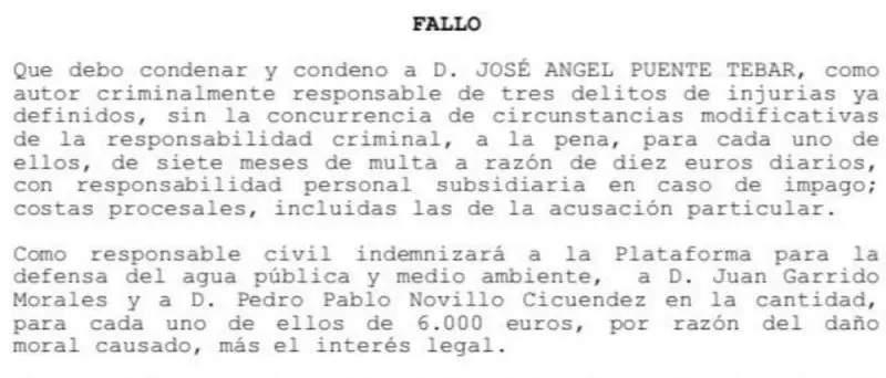 Según el fallo, como responsable civil, Puente deberá indemnizar a la Plataforma del Agua, a Juan Garrido y a Pedro Pablo Novillo con 6.000 euros para cada uno, "por el daño moral causado", más los intereses.