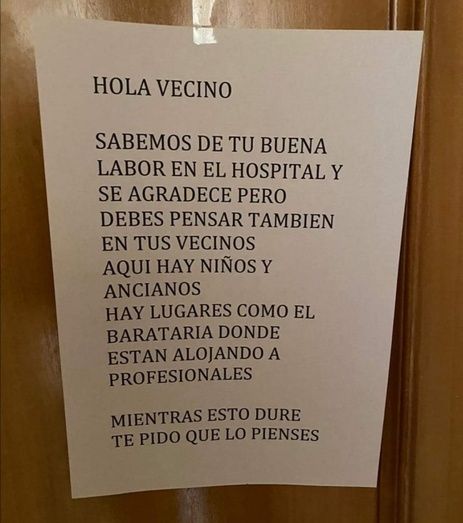A través de las redes sociales, un familiar de este médico hizo público el cartel, denunciando su indignación y rabia ante tal recibimiento, pues se trata de un profesional esencial que cada día está arriesgando su propia vida para prestar ayuda sanitaria a quien lo necesita.