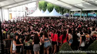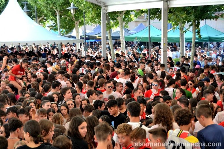 La plaza de Santa Quiteria y la gran carpa instalada para la denominada "Feria de Día" se ha visto desbordada, literalmente tomada por cientos de adolescentes y jóvenes, eufóricos, saltando, gritando, bailando, unos bebiendo y otros mirando... Y en muchos casos, ataviados con la camiseta blanca y el pañuelo rojo típico de las fiestas de Alcázar.