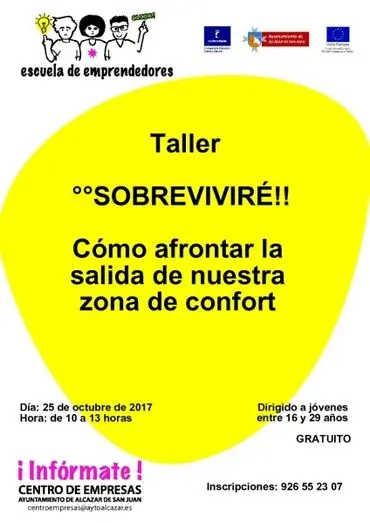 La Escuela de Emprendedores del Ayuntamiento de Alcázar de San Juan organiza el taller “Sobreviviré: cómo afrontar la salida de nuestra zona de confort” dirigido a jóvenes de entre 16 y 29 años, que cumplan los requisitos para formar parte del sistema nacional de Garantía juvenil (ni trabajar, ni estar estudiando dentro de un programa de formación reglado).