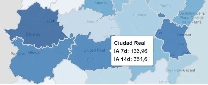 Las ciudades de la provincia de Ciudad Real más afectadas son la capital, con 553 nuevos positivos en 15 días (270 + 283); Puertollano, con 262 nuevos casos (116 + 146); y Valdepeñas, con 212 entre las dos semanas, 133 en la 51 y 79 en la 52.
