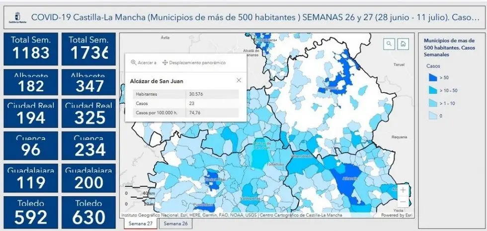Según los datos aportados por Sanidad, Alcázar de San Juan ha pasado de 4 positivos en la semana 27 a un total de 23 en la semana 28, por lo que suma 27 en quince días. En el caso de Campo de Criptana, los positivos se mantienen, dos casos en la semana 27 y otros dos en la semana 28, con lo que registra 4 positivos en los últimos quince días.