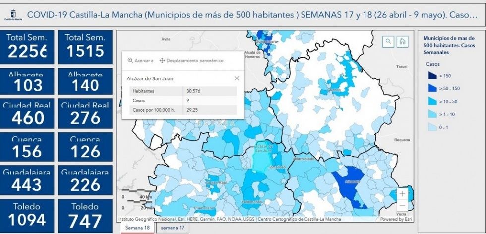 Alcázar de San Juan suma 23 positivos en las dos semanas, 14 hasta el 2 de mayo y 9 hasta el domingo 9 de mayo; Campo de Criptana ha subido en positivos, pasando de 10 en la semana 17 a 14 en la semana 18; Herencia ha bajado sus positivos, con un total de 5 en quince días, 4 en la semana 17 y uno en la última semana, Socuéllamos cuenta con 17 positivos, 10 en la semana 17 y 7 en la semana 18. Tomillos también ha bajado sus positivos, pasando de 37 a 28, suma un total de 65, y por último Manzanares Manzanares, que también ha bajado de 30 hasta el 2 de mayo a 11 en la última semana.