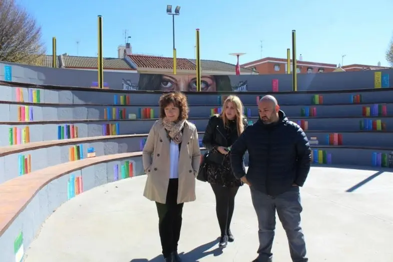La alcaldesa de Alcázar de San Juan, Rosa Melchor, acompañada por el concejal de Obras y Proximidad, Javier Ortega y la concejala de Juventud, Bárbara Sánchez-Mateos, visitó el Parque Cervantes para ver el trabajo realizado por los artistas urbanos Francisco José Jiménez Campoy (Fran) y Ángel Caballero Rioja (Max501) en las gradas del auditorio que corona esta zona de recreo.
