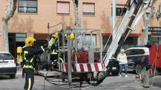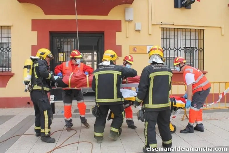 Éste ha sido el argumento de un simulacro de emergencia que ha tenido lugar esta mañana en la Comisaría de Alcázar, en la que un derrumbe en las instalaciones ha generado un incendio dejando herido a uno de los agentes que trabajaba en el Archivo, y que ha sido rescatado por los bomberos a través del balcón.