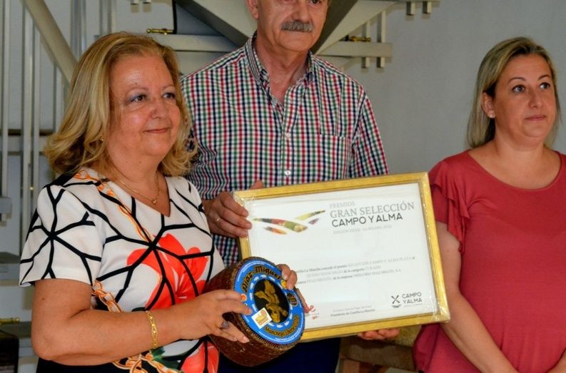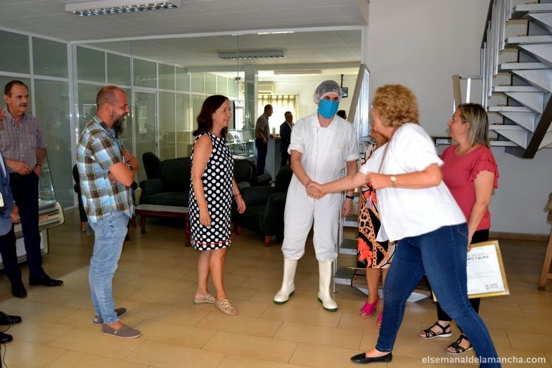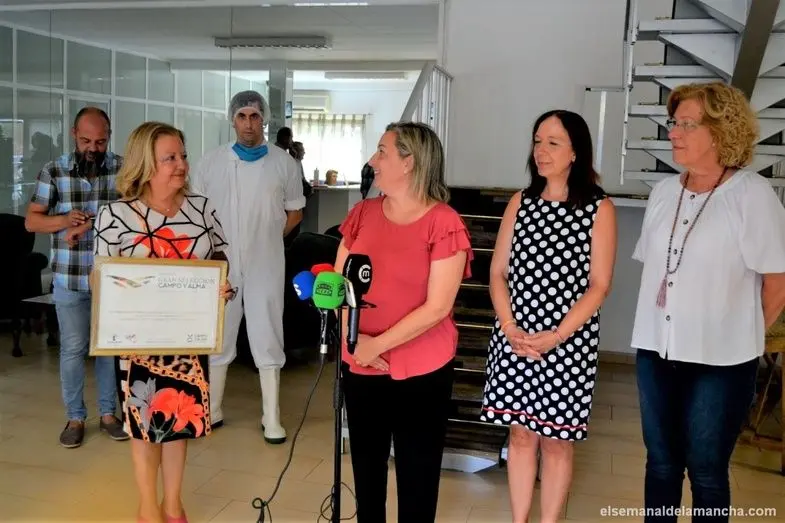 La directora general de Alimentación, Elena Escobar; y la delegada provincial de Agricultura, Amparo Bremard, han hecho esta mañana entrega del premio de Plata conseguido por la empresa alcazareña Quesos Gregorio Diaz-Miguel, dentro de los Premios Gran Selección Campo y Alma, en la categoría de curados. Un queso manchego con denominación de origen y acogido a la marca Campo y Alma, que esta mañana ha recibido el reconocimiento del gobierno regional y del Ayuntamiento, representado por la alcaldesa, Rosa Melchor y el concejal Mariano Cuartero, quienes también han querido sumarse a la visita y agradecer a Macarena Diaz-Miguel, encargada de recoger el premio, así como a toda la plantilla actual de esta quesera, el trabajo realizado.