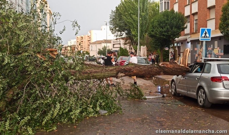 La fuerte tormenta de viento y lluvia que ha caído este miércoles sobre Alcázar de San Juan ha dejado numerosos desperfectos en sus calles, árboles caídos sobre vehículos, ramas en las calles, parques cerrados, sillas y mesas de terrazas desperdigadas por las calles y mobiliario urbano dañado. Entre otros desperfectos, han caído vallas publicitarias y se ha derrumbado parte del muro de las urgencias del Hospital.