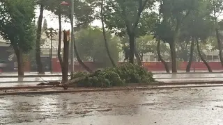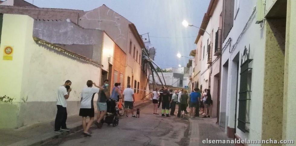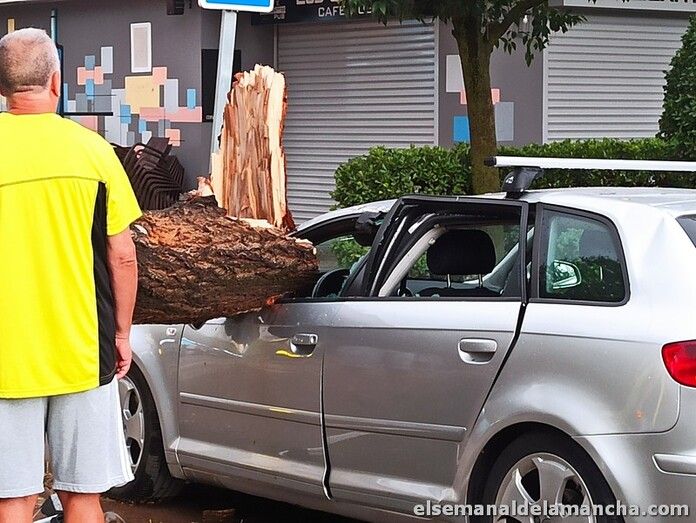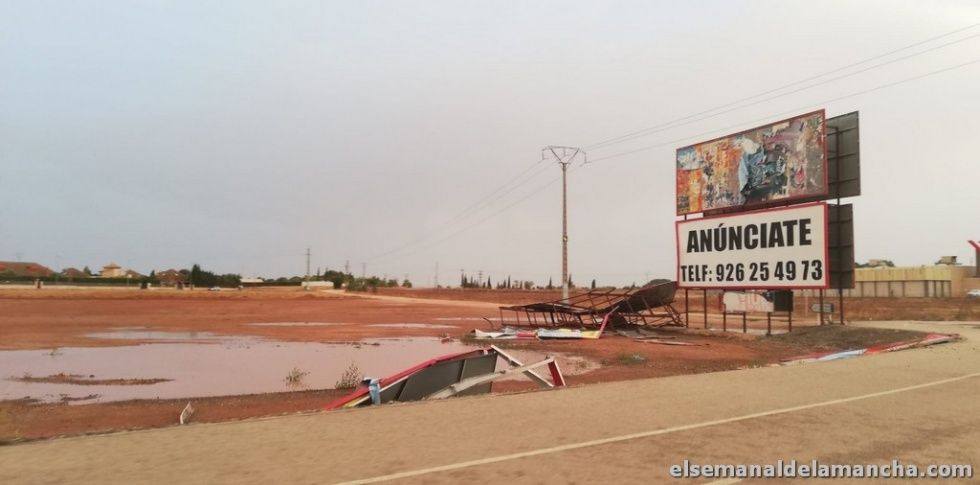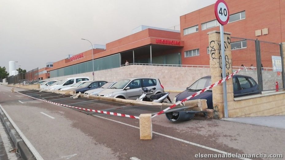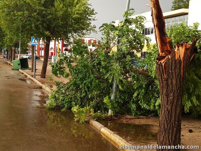 La fuerte tormenta de viento y lluvia que ha caído este miércoles sobre Alcázar de San Juan ha dejado numerosos desperfectos en sus calles, árboles caídos sobre vehículos, ramas en las calles, parques cerrados, sillas y mesas de terrazas desperdigadas por las calles y mobiliario urbano dañado. Entre otros desperfectos, han caído vallas publicitarias y se ha derrumbado parte del muro de las urgencias del Hospital.