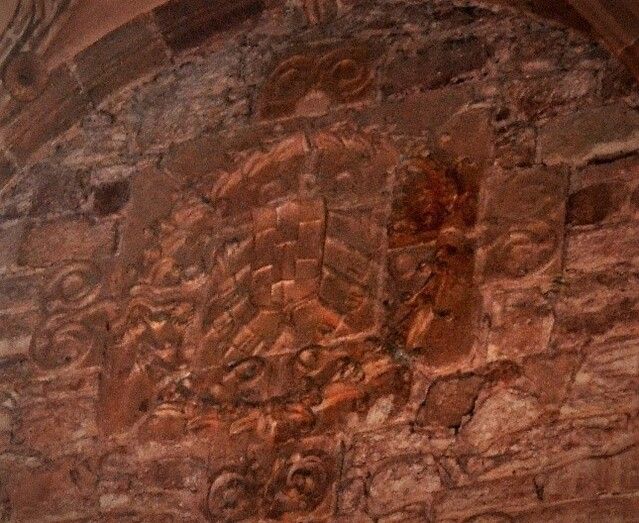 Fig.2. Emblema de los Grandes Priores, parte superior del presbiterio y que suele pasar desapercibida a los fieles a pesar de su importancia histórica para Alcázar. Formada por: Escudo de D. Diego de Toledo apreciando en el centro el Escudo de armas del linaje de los Alba, cuatro banderas abatidas a la derecha y otras cuatro a la izquierda: al timbre una cruz patada con brazo transversal sobre alargado, dos cordones franciscanos acolados formando parejas de espirales y guirnalda a modo de corona circular envolviendo en conjunto. Fotografía elaborada y cedida por Rosalinda Tejera et al, directora del elsemanaldelamancha.com.