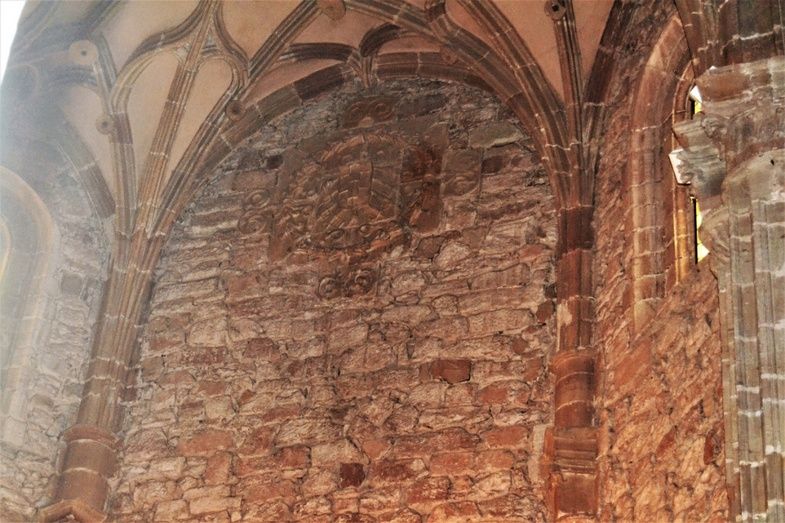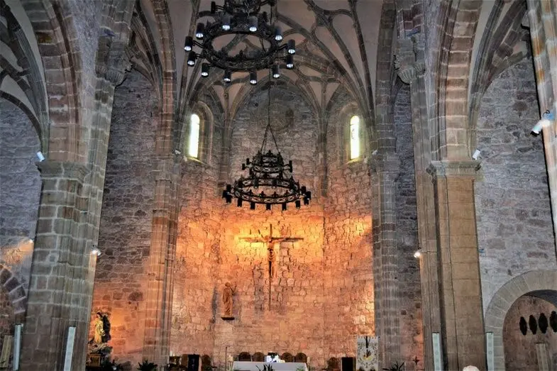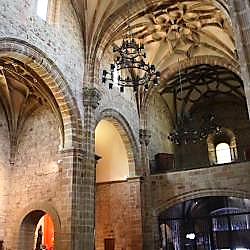 Fig.1. El templo dispone de una sola nave con capillas ahora comunicadas entre ellas (en sus inicios incomunicadas). Apreciar bóvedas nervadas y al fondo presbiterio donde se puede apreciar en parte alta blasón de los Grandes Priores (ver Parte II, Fig. 1).