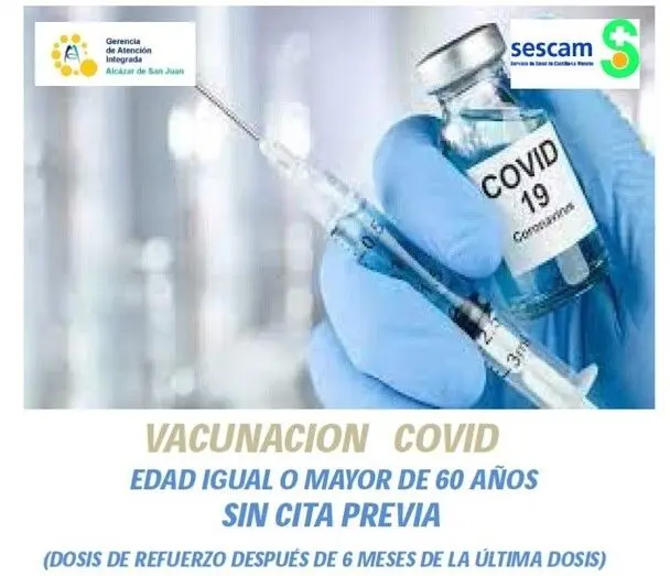 El Servicio de Salud de Castilla-La Mancha ha organizado unas jornadas de vacunación masiva, sin cita, de la dosis de recuerdo de COVID-19 para personas mayores de 60 años en centros de la Gerencia de Alcázar de San Juan. Los días y horarios son los siguientes: