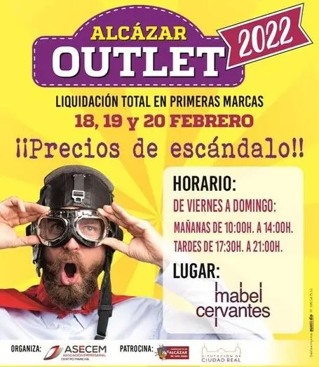 El Alcázar Outlet se inaugurará este viernes 18 a las 18:00 horas en los Salones Mabel de Alcázar de San Juan y permanecerá abierto hasta las 21:00 horas. El horario de la Feria será de 10:00 a 14:00 horas y de 17:30 a 21:00 horas.