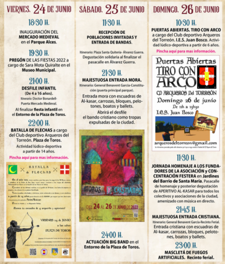 El domingo a las 10,30 en el IES Juan Bosco, habrá jornada de puertas abiertas de tiro con arco. A las 11,30 homenaje a los fundadores de la asociación en el barrio de Santa María con desfiles y convivencia que terminará con un aperitivo para asociaciones que quieran asistir. A las 21,45 será la Majestuosa entrada Cristiana desde Doctor Bonardell hasta el ferial para acabar a las 24 horas con la mascletá.
