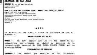 Diligencias en las que se dispone que Ortega y Octavio sean citados el 13 de marzo de 2017, a las 10,30 horas, para oírseles en declaración como investigados; así como al propio Ángel Puente, en calidad de perjudicado. Aunque en el auto no aparece tipificado el delito, en los fundamentos de derecho sí se afirma que “los hechos que resultan de las anteriores actuaciones (denuncia) presentan características que hacen presumir la posible existencia de delito” (según el ex concejal , “presunta financiación ilícita, entendiendo que cualquier partido político, en concreto el PP, no puede sufragar los gastos electorales con partidas que no sean ex profeso para dichos gastos; y que jamás podrá sufragar gastos electorales con partidas que el grupo municipal del PP reciba del Ayuntamiento de Alcázar de San Juan”).