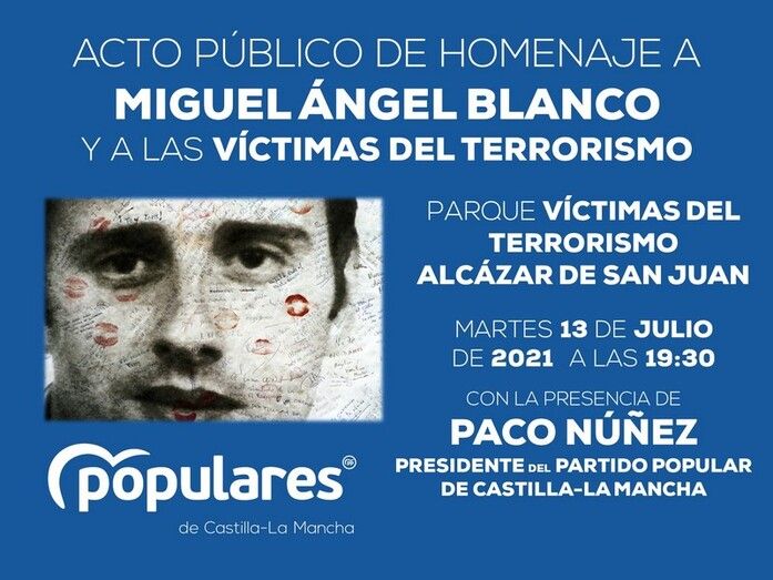 En el acto público, intervendrá el Presidente del Partido Popular en Castilla-La Mancha, Paco Núñez, para rendir un sentido homenaje al que fuera concejal del PP en la localidad de Ermua (Vizcaya). Miguel Ángel Blanco fue secuestrado en la mañana del 10 de julio de 1997, asesinado en la tarde del 12 de julio y fallecido en la madrugada del 13 de julio del mismo año a manos de la banda terrorista ETA.