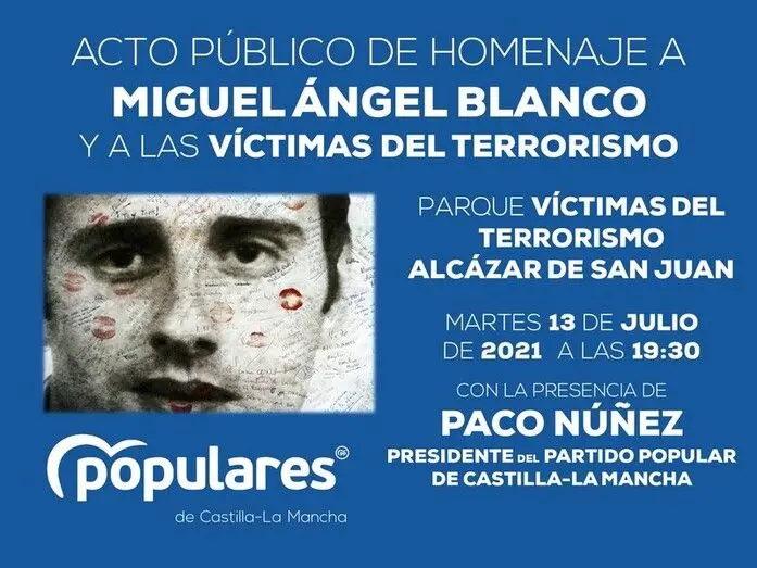 En el acto público, intervendrá el Presidente del Partido Popular en Castilla-La Mancha, Paco Núñez, para rendir un sentido homenaje al que fuera concejal del PP en la localidad de Ermua (Vizcaya). Miguel Ángel Blanco fue secuestrado en la mañana del 10 de julio de 1997, asesinado en la tarde del 12 de julio y fallecido en la madrugada del 13 de julio del mismo año a manos de la banda terrorista ETA.