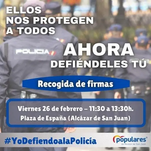 El Partido Popular de Alcázar de San Juan ha convocado, para este viernes a partir de las 11:30 horas, el inicio de una recogida de firmas en apoyo a las Fuerzas y Cuerpos de Seguridad del Estado.