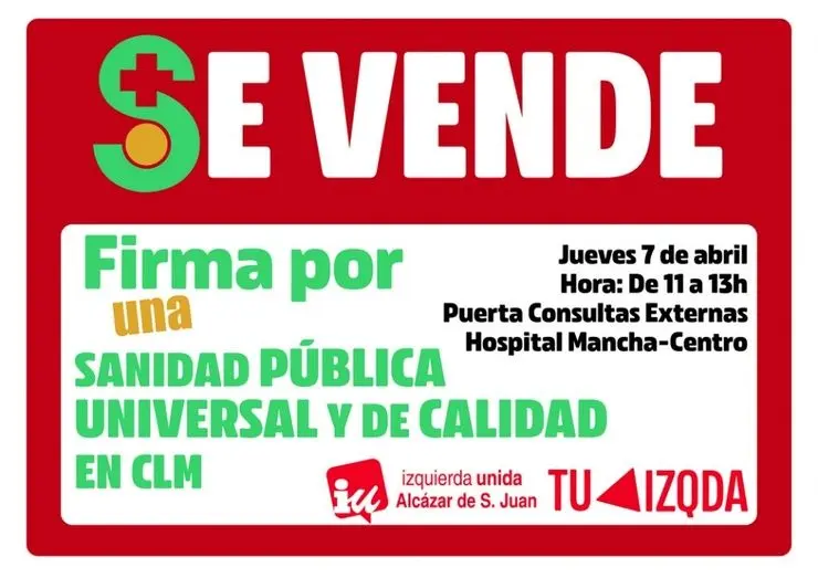 Desde la Coordinadora Local de Izquierda Unida de Alcázar se suman a esta iniciativa e instalarán una mesa de recogida de firmas en defensa de la sanidad pública en las inmediaciones de la entrada de consultas externas del del Hospital La Mancha Centro, desde las 11 hasta las 13 horas del mencionado 7 de abril.