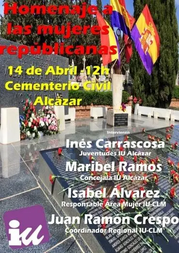 El primer acto será un homenaje a las mujeres republicanas, a las 12 horas, en el Cementerio Civil de Alcázar. El acto será presentado por Inés Carrascosa (Juventudes de IU Alcázar) y en el mismo intervendrán Maribel Ramos (Concejala de IU en el Ayto. de Alcázar), Isabel Álvarez (Responsable del Área de la Mujer de IU-CLM) y Juan Ramón Crespo (Coordinador Regional de IU-CLM).