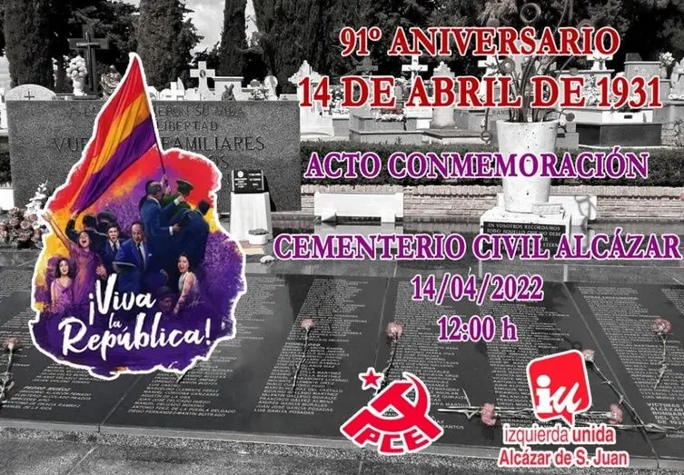 Este jueves 14 de abril, la Asamblea Local de IU y el Núcleo Local del PCE en Alcázar van a celebrar un acto de conmemoración del 91 aniversario de la proclamación de la II República (14 de abril de 1931), en el que tendrá lugar una ofrenda floral y se rendirá homenaje a quienes dieron su vida para defender la Constitución de 1931. Será a las 12 horas en el Cementerio Civil de Alcázar,