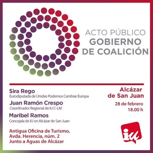 Igualmente se contará con la participación del coordinador regional de IU C-LM, Juan Ramón Crespo, y Maribel Ramos, concejala de IU en Alcázar de San Juan.