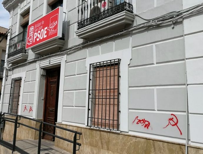 La sede de la Agrupación del PSOE de Alcázar de San Juan, situada en la calle Rondilla de la Cruz Verde, ha amanecido esta mañana de sábado con pintadas en su fachada. Con spray de color rojo, aparece la figura de la hoz y el martillo, Desde el Partido Socialista Alcazareño lamentan "que haya personas que se expresen con esta actitud antidemocrática y dañando el patrimonio".