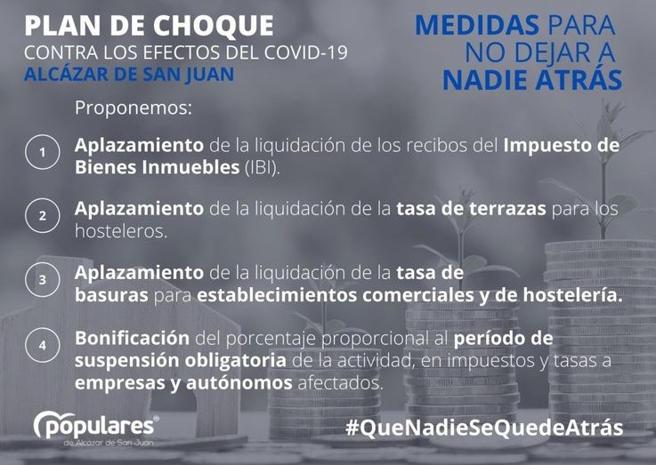 Tras la declaración del estado de alarma en la Nación, desde el Partido Popular de Alcázar de San Juan y del Grupo de Concejales en el Ayuntamiento decidieron realizar varias propuestas “pensando siempre en las familias, en los autónomos y en las empresas, para que los efectos de la crisis sanitaria sea más llevaderos para los sectores más vulnerables”.