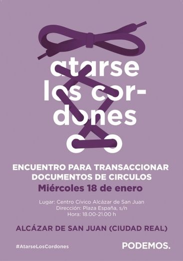 Podemos celebrará su próxima asamblea ciudadana estatal el próximo 11 y 12 de febrero. Según se informa en un comunicado de prensa, “y en relación a este evento, nos encontramos en el período de transacción de documentos elaborados por los "círculos" de nuestra región, y en la ruta "Atarse los cordones" hemos organizado un encuentro de carácter regional”, este encuentro se va a celebrar en Alcázar de San Juan este 18 de enero a las 6 de la tarde en el Centro Cívico.